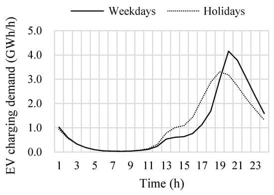 The electricity demand of the private EV fleet was assumed as follows. Based on a nationwide survey, the annual average mileage of private cars was approximately 5326.5 km/year/vehicle []. Assuming an EV efficiency of 7.0 km/kWh, the annual electricity demand was approximately 894.7 kWh/year/EV. Assuming that each EV starts charging at 3.0 kW immediately after returning home to recover its SOC, the total charging pattern of the EVs was calculated, as shown in Figure 4. Although peak demand occurred in the evening, it was small compared to the demand shown in Figure 1 and therefore had a minor impact on the power system. It was assumed that sufficient chargers exist and that all EVs could be connected to a charger. A method to control the timing and amount of electricity demand is known as smart charging, but this study did not consider smart charging because it focused on evaluating the value of controlling the power flow from EVs to the grid in terms of available LFC capacity.