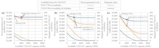 Annual power generation cost and marginal value of vehicle-to-grid (V2G) load-frequency control (LFC) capacity for each VRE penetration scenario: (a) low, (b) middle, and (c) high.
