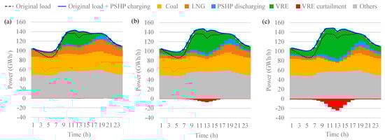 Table 6 shows the annual fuel-cost reductions for LNG and coal and the reduction cost per unit of electricity generation. Under the low-VRE scenario, VRE curtailment was minimal and coal generation increased (shown as negative cost-reduction values). The increased cost per unit of coal generation was approximately USD 2.3–12.9/MWh, which is markedly lower than the fuel cost shown in Table 3. This is because the number of generators in partial-load operation was reduced, and other generators operated more efficiently, thereby minimizing the increased total fuel cost associated with increased power generation. In other cases, the reduced unit costs of coal and LNG were equivalent to the fuel costs of electricity generation in Table 3; hence, it was assumed that coal and LNG were simply reduced or replaced with VRE and PSHPs.