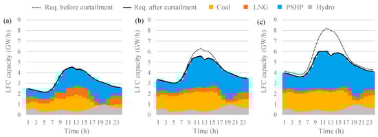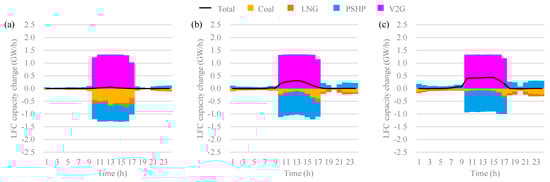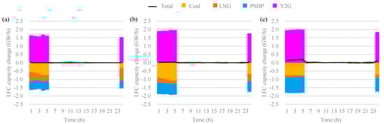 The changes in the average power generation caused by the overnight V2G LFC are shown in Figure 10. Under the low-VRE scenario, LNG replaced coal from 23:00 to 5:00 when V2G provided the LFC capacity. Under the middle-VRE scenario, the PSHP discharge markedly decreased from 23:00 to 5:00 and shifted to reduce expensive LNG from 17:00 to 22:00. Under the high-VRE scenario, VRE increased (WT avoided curtailment) from 23:00 to 5:00, and PSHP discharge further decreased the LNG capacity from 17:00 to 22:00. These results indicate that overnight V2G LFC produced fuel-cost savings during those hours and that, under higher VRE scenarios, the thermal power was reduced by shifting the PSHP discharge from 17:00 to 22:00. The change in the ensured LFC capacity caused by the overnight V2G LFC is shown in Figure 11. The V2G LFC capacity replaced other resources during providing hours, and the total ensured LFC capacity increased under the high-VRE scenario.