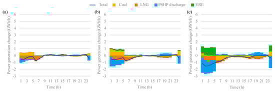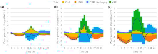Average daily power generation changes by overnight V2G (available V2G LFC capacity: 2016 MW) under different VRE penetration scenarios: (a) low, (b) middle, and (c) high.
