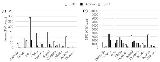 In this section, we present changes in interconnection line operations and the internal energy balance of each area, due to V2G. The middle-VRE scenario without V2G is shown in Figure 12 to illustrate the basic power system operations supporting the annual total power generation and the ensured LFC capacity. Power generated and consumed in the local area is referred to as “self,” power procured externally through the interconnection line is referred to as “receive,” and power supplied externally is referred to as “send.” Self-generation predominated in all areas, and the power supply through the interconnection lines was the largest from Tohoku to Tokyo. In terms of the LFC capacity, the LFC was supplied in the opposite direction to the energy supplied between Tokyo and Tohoku. Because flexibility for VRE generation was insufficient in Tohoku, Tohoku received LFC capacity from Tokyo. Consequently, VRE curtailment in Tohoku decreased, and VRE power from Tohoku was consumed in Tokyo. Transfers of LFC capacity also occurred between other areas. For example, LFC capacity was supplied eastward from Chubu to Tokyo, from Kansai to Chubu, and from Shikoku and Chugoku to Kansai.