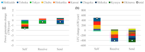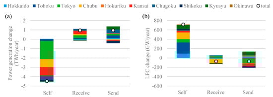 Figure 13 shows total annual changes from the basic operations caused by daytime V2G. Reductions in PSHP discharges and thermal power generation (Figure 8b) markedly reduced self-consumption in areas where these sources were abundant, such as Tokyo, Chubu, and Kansai. Energy transfer through interconnected lines increased from areas with abundant VRE and low demand (Tohoku, Kyusyu, and Chugoku) to high-demand areas (Tokyo, Chubu, and Kansai). This is because areas with low demand were unable to consume the increased VRE power generation attributed to V2G. Self-consumption of LFC capacity increased due to the ease of procurement by V2G, as shown in Figure 13b. Conversely, the transfer of the available LFC capacity through interconnected lines decreased.