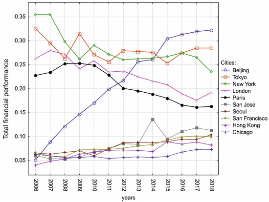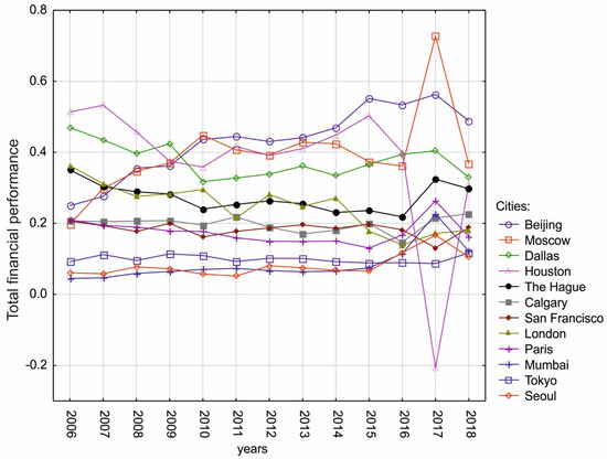 Financial performance data for each major metropolitan area, without division into specific sectors, were graphed to show changes in fiom for the period 2006–2018. Given the set of analyzed cities, the largest change was noted for Beijing from 0.05 in 2006 to 0.32 in 2018. This was one of the largest percentage gains in the studied period of time (640%). The largest increases were observed in the years 2006–2013 when the annual average reached almost 50%, with the annual average being only about 40% for the entire study period. Extremely high growth above 1000% was noted for the Chinese cities of Shenzhen and Shanghai, although the changes affected very low values—from 0.005 to 0.06 (Figure 1). A similar situation was observed for cities where energy sector firms showed weaker financial performance and fluctuations, therein, had led to large changes in index values. The cities of Bogota, Tianjin, and Manila recorded changes over 500%. In Europe, large changes were noted for the cities of Eindhoven, Valencia, Leuven, and Zurich (more than 300% each).