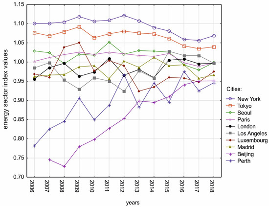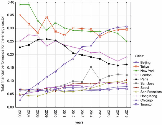 In the same period of time, cities with the highest index values (more than 0.20) experienced a decline (i.e., Paris and London) or stagnation with a small decline (Tokyo and New York). The largest decline for New York and Tokyo occurred in the years 2006–2009, which may have been caused by the Global Financial Crisis of 2008. On the other hand, large declines were not noted for London and Paris, as these cities experienced the largest declines after the year 2012 (Figure 2). Beijing noted the largest relative growth from 0.25 to 0.49 or about 96% relative to the start of the study period. The largest increase occurred in the years 2006–2010 during the years of the Global Financial Crisis of 2008. It appears that this crisis did not affect the energy sector in the city of Beijing. Another city characterized by large values of the financial index and large increases in this index for the energy sector was Moscow—rising from 0.20 to 0.37, for a growth of 85%.