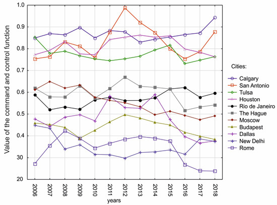 The significance of the energy sector in cities varies. The paper considers only cities with the highest fiom potential and at least two major sectors of the economy. The largest share of the energy sector in the C & C function was noted for Calgary (9% growth) and San Antonio (12% growth). In the latter case, as in the case of many other cities with a strong energy sector (i.e., Budapest, the Hague), the share of this sector increased after the 2008 Global Financial Crisis, lasting until 2012–2013. The following cities noted a decline: Beijing −28.5%, New Delhi −14%, Perth −13.7%, Moscow −12%, and San Francisco −11.8%. Major urban centers of command and control such as Tokyo and New York were not found to be affected by large changes (Figure 3).