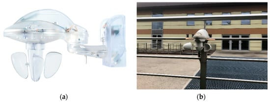A Meteodata 140 S KNX weather station, (a) general view, (b) installation in the analyzed building.