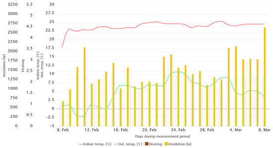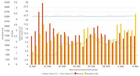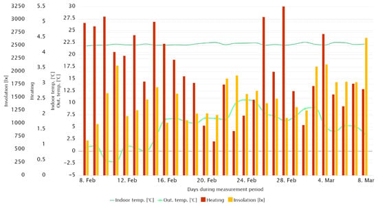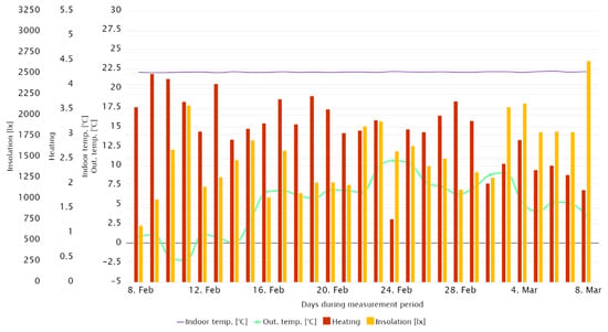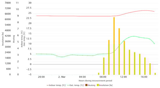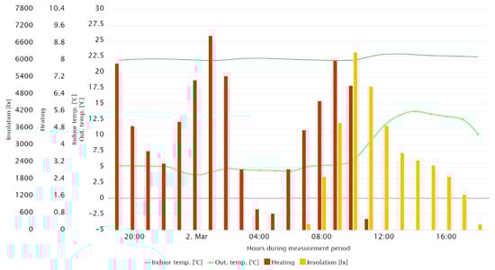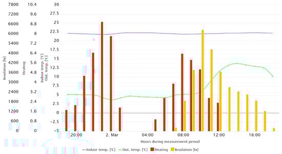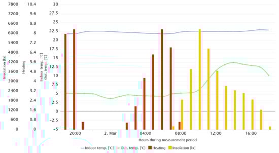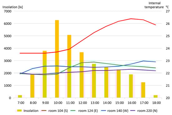 Figure 14 shows the waveforms of the internal temperature of particular rooms, which were directly exposed to solar radiation, referring to the hourly recorded average value of insolation for all cardinal directions. The figure shows that the temperature in the room with the window facing south was higher than in the others, despite the heating being turned off. In addition, an increase in temperature could be noticed during the hours of the highest insolation, despite the presence of cloudiness. Cloudiness was indicated by the lower value of insolation at noon than 2 h earlier. A similar situation could be observed in the case of rooms exposed on the east and on the west; however, the insolation impact on the room’s internal temperature was significantly lower than in the previously described room, while the maxima of internal temperatures were shifted earlier and later, respectively, depending on the sun’s position in the sky.