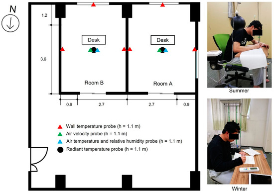 The experiments were conducted during the summer (August–September) 2019, winter (January–March) 2020, and summer (July–September) 2020 in Toyohashi, a city located in the southeastern Aichi Prefecture in Japan (34°46′9″ N, 137°23′29.5″ E). The city climate is hot and humid in the summer and cold and dry in the winter. The experiment started at 10:00 Japan Standard Time (JST) and was performed in the experimental room of the Building Energy Laboratory at the Toyohashi University of Technology. The temperature could be controlled by AC. Figure 1 shows the floor plan of the experimental room and sensor positions. The exterior walls of the experimental room are mostly reinforced concrete, while the interior walls are mostly plasterboard with an aluminum frame.