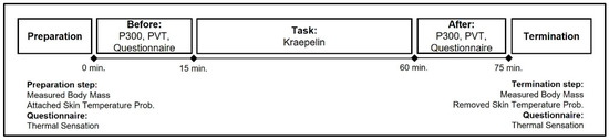 The temperature and relative humidity of the experimental room were measured using an illuminance UV recorder (TR-74Ui, T&D Corp., Matsumoto, Japan). The air velocity and mean radiant temperature (MRT) in the experimental room were measured using a 6332D air flow transducer (Kanomax Japan Inc., Tokyo, Japan) and a globe temperature probe, respectively, all recorded on a GL840 data logger (Graphtec Corp., Yokohama, Japan). Probes were placed at the center of the room (see Figure 1). Physical environment loggers (TR-74Ui and GL840) were activated prior to the beginning of the experimental procedure (Figure 2). The skin temperature logger was activated immediately upon the participants’ entry into the experimental room and turned off after the experiment was finished. To investigate the data during experiment, the skin temperature and physical environment data were selected according to range of experimental times as depicted in Figure 2 (0 when the experiment started and 75 when the experiment finished). We also calculated the predicted mean vote (PMV) by combining the data from physical factors, including air temperature, radiant temperature, air velocity, relative humidity, and human factors, including the amount of clothing insulation and metabolic rate [39]. PMV is represented on a numeric scale from −3 to +3 (−3, cold; −2, cool; −1, slightly cool; 0, neutral; 1, slightly warm; 2, warm; and 3, hot).