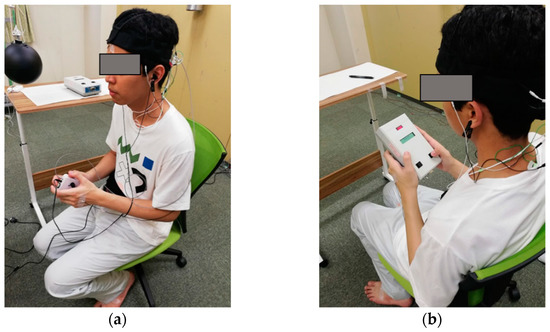 In this study, we performed an oddball paradigm task using a sound stimulus to induce the P300. The non-target stimulus was 1 kHz, and the target stimulus was 2 kHz. The appearance frequency for non-target and target stimuli was set to 70% and 30%, respectively. The appearance interval of the sound stimulus was 1.5 s, and the task was terminated when the sound stimulus appeared 100 times. Each participant was instructed to press the button on the sound stimulus generator immediately upon hearing the target, and then focus on the task. During this assignment, participants were also instructed to stare at a cross point on the wall to minimize noise in the EEG due to eye movement (see Figure 3a).