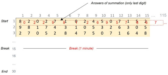 In the main task, each participant took a 30-row (1 min per row) U–K test with a 1-min break after 15 rows (Figure 4). The U–K tests are simple summation tests for mathematical problems that indicate the participant’s personality [46,47]. The objective results of the U–K test represent speed, correct answering rate, accuracy, and consistency and are strongly influenced by sensory perception and motor response [48]. Speed is calculated as the average number of correct sums per line (in 1 min), whereas the correct rate is the mean correct rate (number of correct answers divided by the number of answers) for each row.