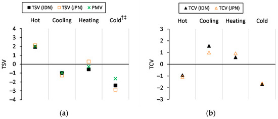 The average of (a) TSVs, and (b) TCVs, during the summer and winter for each experimental condition. † Significantly different between TSV (IDN) and PMV at p < 0.05. ‡ Significantly different between TSV (JPN) and PMV at p < 0.05.