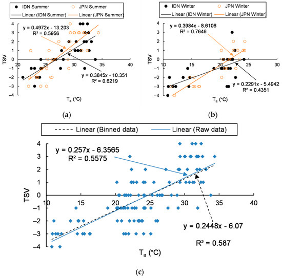 Figure 6a,b, depict the correlation between indoor air temperature and TSV of the IDN and JPN groups during the summer and winter. Furthermore, Figure 6c shows the correlation between TSV for raw data and binned data. Interestingly, the slopes and constants of both (raw data and binned data) are similar. Comparable with the previous studies, this linear trend indicates that respondents staying in colder air temperatures preferred warmer indoor environmental conditions, and vice versa [50,51].