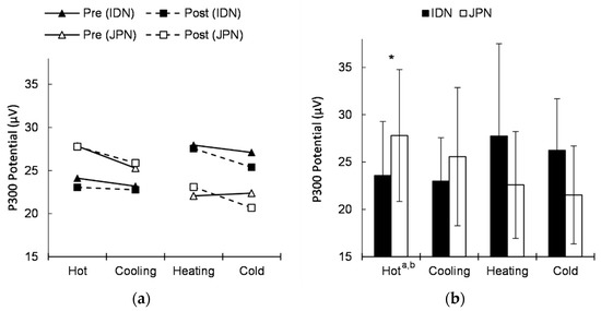 Average P300 potential in (a) pre-/post-U–K test and (b) each condition. Abbreviation: IDN, Indonesian; JPN, Japanese. * Significantly different between IDN and JPN at p < 0.05. a Significantly different P300 potential of IDN between hot and cold condition at p < 0.05. b Significantly different P300 potential of JPN between hot and cold condition at p < 0.05.