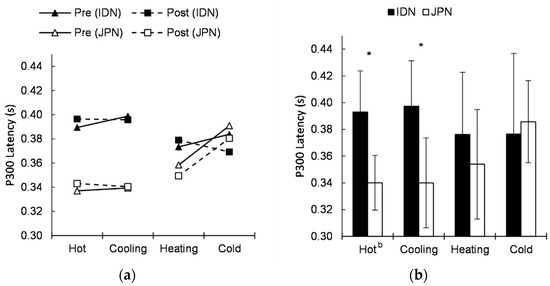 Average P300 latency in (a) pre-/post-U–K test and (b) each condition. Abbreviation: IDN, Indonesian; JPN, Japanese. * Significantly different between IDN and JPN at p < 0.05. b Significantly different P300 latency of JPN between hot and cold condition at p < 0.05.