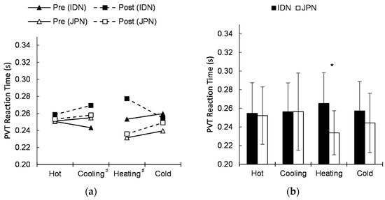 Figure 9a shows the RT in the pre-/post-U–K test in all conditions. The RT of the IDN group was delayed after the U–K test in the cooling and heating conditions (all ps < 0.05). Meanwhile, the RT of the JPN group did not change after the U–K test in all conditions (all ps > 0.05).