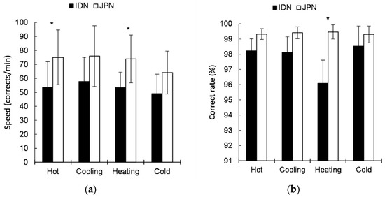 The U–K test speed was different between groups (p < 0.05; df = 1; F = 31.61). Moreover, Figure 10a shows that the U–K test speed differed between hot and heating conditions. However, it was not different among all conditions and in the interaction between nationality and condition. With respect to the correct rate of the U–K test, as shown in Figure 10b, we also found differences between IDN and JPN (p < 0.05; df = 1; F = 11.27). However, it did not differ among conditions and in the interaction between nationality and condition.