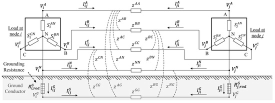 - A more accurate branch model is modified, which is in the 3 × 3 matrix deriving from the impedances of the phase-A, -B, -C, neutral, and ground conductors together with the grounding resistances.