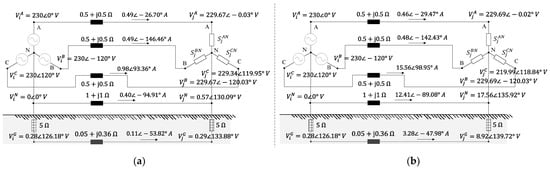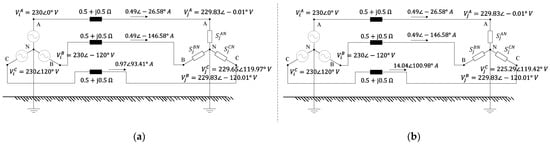 The simplified branch model using Kron’s reduction is already stated in Section 2.3. The main problem of this model is that the neutral voltage is set to zero although load unbalance is varied. It contrasts with the load unbalance principle in [15] that the neutral voltage will be changed when load unbalance is varied. For the example, as shown in Figure 2a, when initial loads at phase A-N, B-N, and C-N of node (, , and ) are , , and W, respectively, the neutral voltage at node () is V. After increasing the load unbalance, if , , and equal to , , and W, respectively, is changed to V, as shown in Figure 2b. For another example, using Kron’s reduction in the circuit of Figure 2, the simplified circuit can be obtained in Figure 3. Load in Figure 3 is used the same as Figure 2, and then the voltage results can be marked in the figure. Both models of Figure 2 and Figure 3 will be compared with the phase-to-neutral voltage results, as shown in Table 1 where ; . It can be noticed that the simplified branch model using Kron’s reduction causes more error on the phase-to-neutral voltage result when the load unbalance is increasing. It is because the simplified branch model determines fixed neutral voltage at zero.