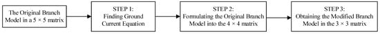 Initially, the ground current equation () must be solved to reduce the original branch model into a 4 × 4 matrix in Section 4.2. Using matrix inversion for Equations (1) and (2), the following equations can be obtained, where according to [3,6,16]; .