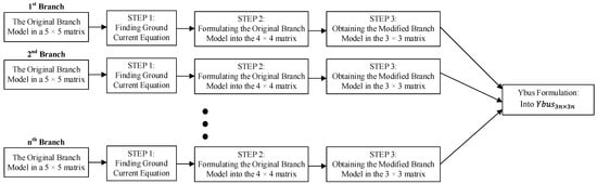The modified 3 × 3 branch matrix is derived from the impedances of the phase-A, -B, -C, neutral, and ground conductors together with the grounding resistances. To obtain this modified branch model, there are three processes, as indicated in Section 3.1.1, Section 3.1.2 and Section 3.1.3, and the relevant flowchart is shown in Figure 4. If a LVDS has many branches, the flowchart of formulating a Ybus matrix can be seen in Figure 5, where the Ybus matrix is the matrix that contains branch connections and impedance data of LVDS.