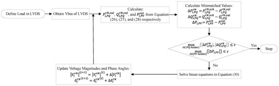 In this section, Equations (26)–(28) are reformulated into the set of linear equations, as shown in Equation (30), by expanding them into the Taylor’s series and leaving all higher order terms. Each variable of Equation (30) is explained in Table 3. Following the conceptual calculation of the NR method [15], Equation (30) will be iteratively calculated, and voltage magnitudes and phase angles will be updated until the criteria in both Equations (31) and (32) are satisfied. The relevant flowchart of solving the improved LF equations by the NR method can be seen in Figure 6, where the superscripts of and mean the defined and calculated values, respectively; is iteration number.