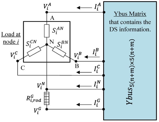 Phase-to-neutral voltage magnitudes are obtained from solving the LF equations, and the modified branch model in Equation (25) does not reveal the existence of the voltages and currents of neutral and ground conductors. Then, these values are assessed in this section through the following four steps.