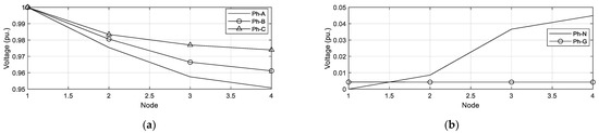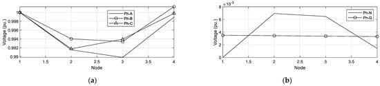 The configuration of the 4-node LVDS with 150-m line sections is shown in Figure A2, where the base voltage and base power are 230 V and 1 MVA, respectively. The load of each node is shown in Table A5.