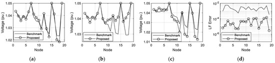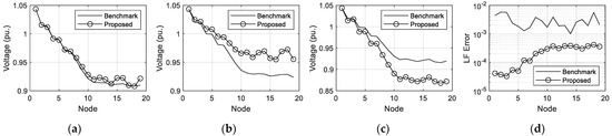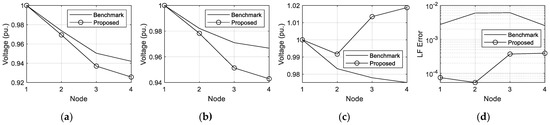 In this section, both the benchmark and proposed methods converge in four iterations and at around 0.11 s. The phase voltage results of the proposed methods, from the voltage and current assessments as stated in Section 3.5, are shown in Figure 8. The comparisons of the phase-to-neutral voltages together with the errors in the LF results between the benchmark and proposed methods are shown in Figure 9. Note that the neutral voltages in the benchmark methods are equal to zero.