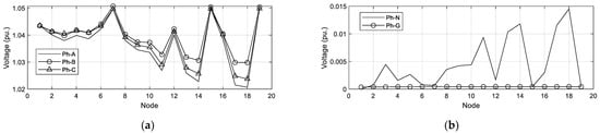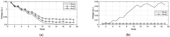 The configuration of the 19-node DS with 30-m line sections is shown in Figure A3, where the base voltage and base power are 230 V and 1 MVA, respectively. The load of each node is shown in Table A6.