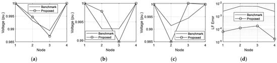 From Figure 9, the phase-to-neutral voltages of the benchmark and proposed methods differ by around 0–0.04 pu., and the proposed method has around ten times less error than the benchmark method.
