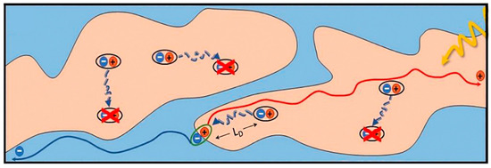 Schematic illustration of exciton dissociation and carrier transport in large phase domains. Reproduced from [43]. Reprinted with permission from ref. [43]. Copyright 2018 MDPI.