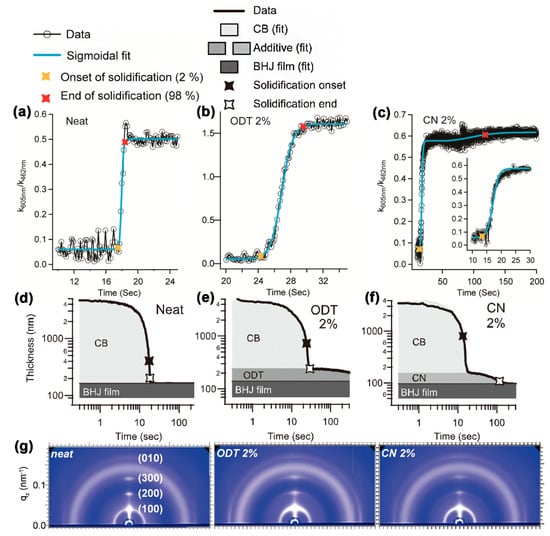 The film–forming process of P3HT/PCBM blend from CB solution (a,d) without additives, (b,e) with 2% ODT and (c,f) with 2% CN. (a–c) The evolution of the extinction coefficient (k) at 605 nm to k at 462 nm. (d–f) Film thickness evolution. (g) GIWAXS diffraction patterns of different solid films. Reproduced from [69]. Reprinted with permission from ref. [69]. Copyright 2013 Wiley.