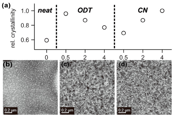 (a) The final relative crystallinity of P3HT/PCBM blend BHJ film from CB solution without additives and with additives in different concentrations. TEM images of films processed (b) with no additive, (c) with 2% ODT, and (d) with 2% CN. P3HT domain is bright, PCBM domain is dark. Reproduced from [69]. Reprinted with permission from ref. [69]. Copyright 2013 Wiley.