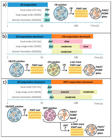 Schematic image of the film drying process in different solvent systems: (a) CB only, (b) CB with CN additive, and (c) CB with ODT. Reproduced from [90]. Reprinted with permission from ref. [90]. Copyright 2014 Wiley.