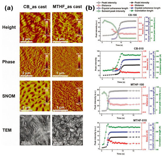(a) Morphology of films treated with different solvents. Top to bottom are AFM height maps, phase diagrams, scattering–type scanning near–field optical microscopy SNOM and TEM. (b) (100) and (010) diffraction peak intensity of GIXD versus time. Reproduced from [70]. Reprinted with permission from ref. [70]. Copyright 2019 Wiley.