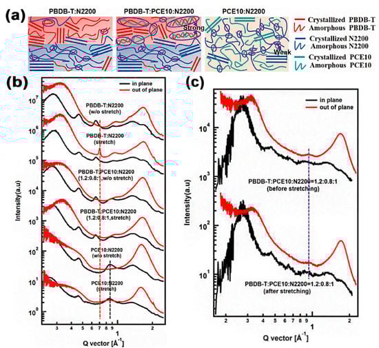 Thanks to the third component, the ternary blend film had a higher deformability. When the active layer contains only two components, such as PBDB–T:N2200 and PCE10:N2200 [98], either the crystallinity of the polymer is too high, resulting in a poor flexibility of the film, or the donor and acceptor have high miscibility, and it is not easy for them to crystallize and form a bi–continuous path conducive to charge transfer (Figure 9a). When a ternary blend film was applied (PBDB–T:PCE10:N2200, 1.2:0.8:1 by weight), the flexibility of the film was greatly improved. As shown in Figure 9b, the peaks of the binary system changed significantly before and after stretching. It reveals the film had unstable morphology under deformation. However, it is difficult to distinguish a new crystallized peak in PBDB–T:PCE10:N2200 blend film, and it was the same after thermal annealing(Figure 9c). Manifesting the stronger entanglements between the donor and acceptor would help to maintain the original morphology under deformation. In other words, appropriately reducing the crystallinity can improve the flexibility of the active layer.