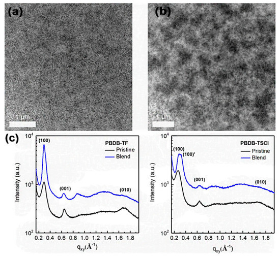 TEM images of (a) PBDB–TF and (b) PBDB–TSCl blend film. (c) The corresponding in–plane line–cut profiles. Reproduced from [99]. Reprinted with permission from ref. [99]. Copyright 2019 American Chemical Society.