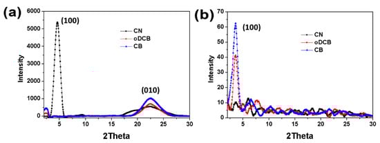 (a) Out–of–plane and (b) in–plane GIXD diffraction intensity for PTB7–th:P(NDI2OD–T2) = 1:1 dry BHJ film cast from CN, o–DCB and CB. Reproduced from [72]. Reprinted with permission from ref. [72]. Copyright 2015 American Chemical Society.