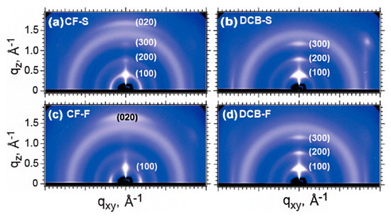 The solvent also determines the film–forming kinetics to a large extent apart from the film–forming method. Take poly{[N,N′–bis(2–octyldodecyl)–naphthalene–1,4,5,8–bis(dicarboximide)–2,6–diyl]–alt–5,5′–(2,2′–bithiophene)}(P(NDI2OD–T2))/poly[4,8–bis(5–(2–ethylhexyl)thiophen–2–yl)benzo[1,2–b:4,5–B’]dithiophene–alt–3–fluorothieno[3,4–b]thiophene–2–carboxylate] (PTB7–th) blends for example: P(NDI2OD–T2) and PTB7–th adopted edge–on and face–on orientations, respectively, when using CN as a solvent [72]. If CN was substituted by solvents with a relatively low b.p., such as o–dichlorobenzene (o–DCB) and CB, the transition of P(NDI2OD–T2) orientation from edge–on to face–on in the PTB7–th/P(NDI2OD–T2) blends would occur, which was illustrated in Figure 12a,b. Therefore, the electron mobility increased from 1.01 × 10−5 cm2 V−1 s−1 to 6.20 × 10−5 cm2 V−1 s−1 and the PCE increased from 0.53% to 3.52% (Table 3). The orientation of the Ph–DTDPo–TE:PBDB–T blend film changed from edge–on to face–on, and the exciton dissociation probability increased from 93% to 96.3% [73]. The optimization is attributed to the consistent molecular orientation of donor and acceptor molecules, which induces a strong built–in electric field of benefit for exciton dissociation.