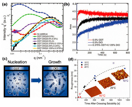 - Richter, L.J.; DeLongchamp, D.M.; Bokel, F.A.; Engmann, S.; Chou, K.W.; Amassian, A.; Schaible, E.; Hexemer, A. In Situ Morphology Studies of the Mechanism for Solution Additive Effects on the Formation of Bulk Heterojunction Films. Adv. Energy Mater. 2015, 5, 1400975. [Google Scholar] [CrossRef]