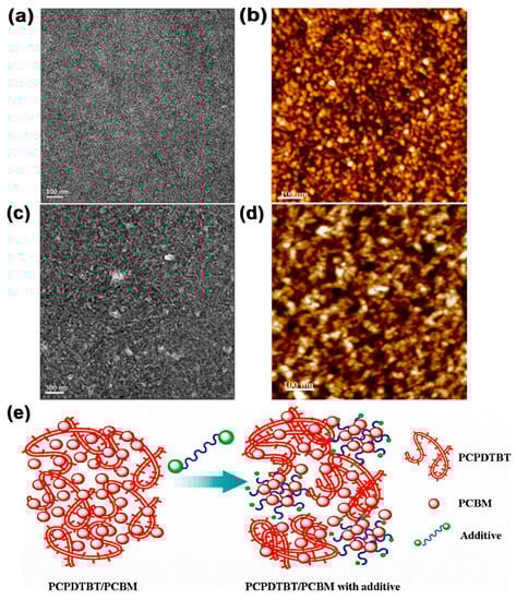 TEM image of PCPDTBT/PC71BM film (a) without and (c) with the addition of the 1,8–diiodooctane. AFM diagram of the PCPDTBT network structure after the removal of PC71BM film treated (b) without and (d) with 1,8–diiodooctane. (e) Schematic illumination of the action of the 1,8–diiodooctane in the self–assembly of bulk heterojunction blend materials. Reproduced from [76]. Reprinted with permission from ref. [76]. Copyright 2008 American Chemical Society.