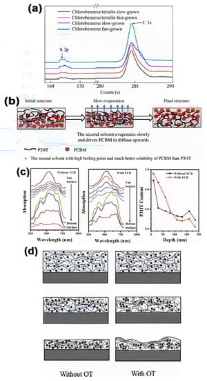 The vertical phase separation structure could be optimized by the regulating film–forming process. Sun et al. [77] prolonged the film–forming process of the P3HT/PCBM blend by adding tetralin as an additive. As the X–ray photoelectron spectroscopy (XPS) (Figure 16a,b) shows, the quality ratio of PCBM to P3HT (mPCBM:mP3HT) near the film surface increased from 0.1 to 0.72 after adding CN. This variation was ascribed to the high solubility of PCBM and slow volatilization rate of CN compared to the main solvent. At the late stage of the film–forming process, parts of PCBM dissolved in the residual CN. As CN evaporated, PCBM migrated from the inside to the surface of the film, driven by the directed diffusion of CN. This kind of vertical phase separation is benefit for charge transport and collection of devices with normal structure. Thus, the PCE is 1.5 times higher than the device fabricated from the solution without CN.