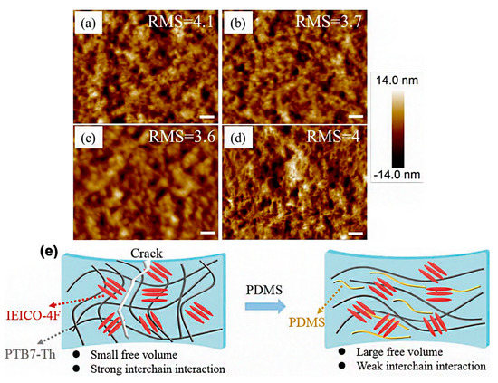 Shao and co–workers reported using a PTB7–th:IEIC–4F blend system to study the effect of additives on morphology when PET/ITO, which is a stretchable substrate, was employed [119]. When 5 wt% PDMS was added to the blend with PET/ITO, compared to the PCE of 10.8% in the glass substrate system without additive, the PCE can be maintained at 10.3%, and did not deteriorate the phase separation structure of the BHJ layer (Figure 17a–d). The illustration (Figure 17e) shows that PDMS can reduce the interchain interactions of the polymer and enhance the volume for polymer chain movement upon extrinsic strain. Due to the enhanced softness, the phase structure of active layer can be protected.