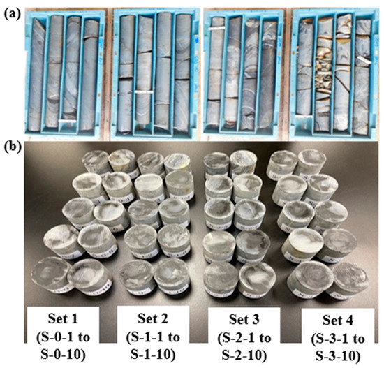(a) Core sample trays; (b) prepared representative samples (S-0-1 to S-0-10; samples for room temperature tests, S-1-1 to S-1-10; samples for 400 °C tests, S-2-1 to S-2-10; samples for 600 °C tests, S-3-1 to S-3-10; sample for 800 °C tests.