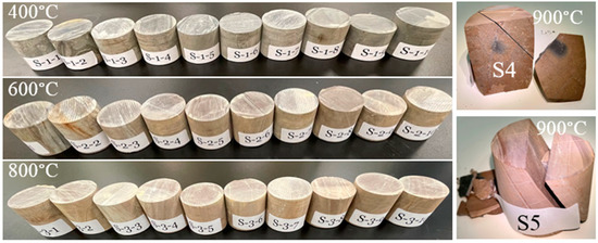 The previously prepared microschist rock samples were heated using a laboratory furnace (CHM-60H, maximum temperature—1600 °C, Jim-bomb Enterprise Co., Ltd., Taiwan). This furnace was used to heat rock samples of set 2, set 3, and set 4 to the target temperatures: 400, 600, and 800 °C, respectively. The minimum target temperature of 400 °C was considered, since findings from previous studies showed that below this temperature, little or no significant change in mechanical and physical properties may be observed, especially for rocks with abundant rock-forming minerals (such as quartz and feldspar), as is the case in this study [18,19,23,25]. In addition, the results of the electrical conductivity study of a rock sample (consisting of quartz, albite, muscovite, and clinochlore) in the study area (Najran, Saudi Arabia) show that the rock exhibited thermal stability up to around 370 °C [48]. Furthermore, to avoid splitting samples into pieces (Figure 4, right-hand side; samples heated to 900 °C), 800 °C was considered as the final target test temperature to make samples suitable for the point load strength index and P-wave velocity experiments. In this study, ten representative samples were heated at once from room temperature to the target temperature of 400 °C at a heating rate of 5 °C/min [44]. The samples were kept at target temperature for an hour and then cooled to room temperature (inside the furnace) at an average cooling rate of 1.5/min to avoid thermal shock, as is the case for rapid cooling [45,49]. This procedure was repeated using another set of ten representative samples at maximum target temperatures of 600 and 800 °C, by keeping the heating rate and cooling rate conditions the same as those used for samples at 400 °C, for quality assurance and quality control purposes.