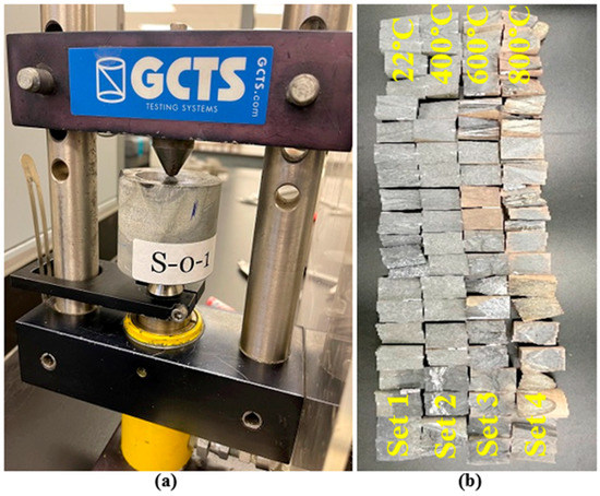 The mechanical and physical properties of rocks are the key parameters in the applications and engineering designs. Unfortunately, some of these properties are subjected to major changes due to heating. Therefore, the investigation of rock’s behavior at high temperature is a hot topic in the literature. Numerous studies have been devoted to characterizing rocks at high temperatures in different areas of specializations, including geothermal energy exploitation [1], underground coal gasification [2,3], nuclear energy disposal [4,5], hydrothermal systems, archaeology [6,7], the construction of roads and buildings [8,9], rock drilling and blasting, underground tunnels [10], thermal energy storage (TES) [11,12,13,14], and deep mining engineering [15]. The changes in rock properties due to heating depend on different parameters including rock’s thermal properties, maximum applied temperature, exposure time, heating/cooling rates, in addition to rock mineral composition and its texture [9,16,17]. If rock’s parameters were altered by increasing temperature, the mechanical and physical properties of rock such as strength (uniaxial compressive strength (UCS)), P-wave velocity, density, mineral phases, and color may be affected.