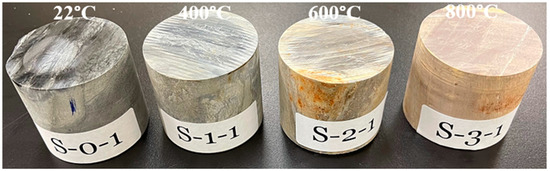 For the petrographic study, representative core samples were physically examined under Leica S9i stereomicroscope (USA), and standard petrographic thin sections were prepared (Figure 3) from representative areas for the samples at 22 °C (room temperature; S1), 600 °C (S2), and 800 °C (S3), to establish host rock lithology, mineral composition, texture, deformation, and alteration. Each representative standard thin sample section was observed microscopically under transmitted light using a research polarizing microscope (Olympus BX53M, Japan), and representative photomicrographs were taken by the digital camera Olympus SC180 attached to the microscope.