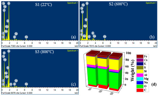 The SEM-EDX (elemental) analysis results of the representative samples of microschist at 22, 600, and 800 °C obtained from five iterated values under normalized conditions are presented in Figure 7. The findings show that the samples predominantly consist of oxygen (O) and silicon (Si), suggesting quartz as the major mineral in the studied rock. The same minor elements can be found in all three samples (Figure 7a–c), except for sulfur (S), which cannot be seen in S1 (Figure 7a), which may be due to the heterogeneous nature of the studied rock sample. It cannot be confirmed whether the effect of heat causes the observed difference in percentage elemental composition in the samples. The weight (%) and atomic percentage of elements present in the studied samples are presented in Figure 7d and Table 1, respectively.